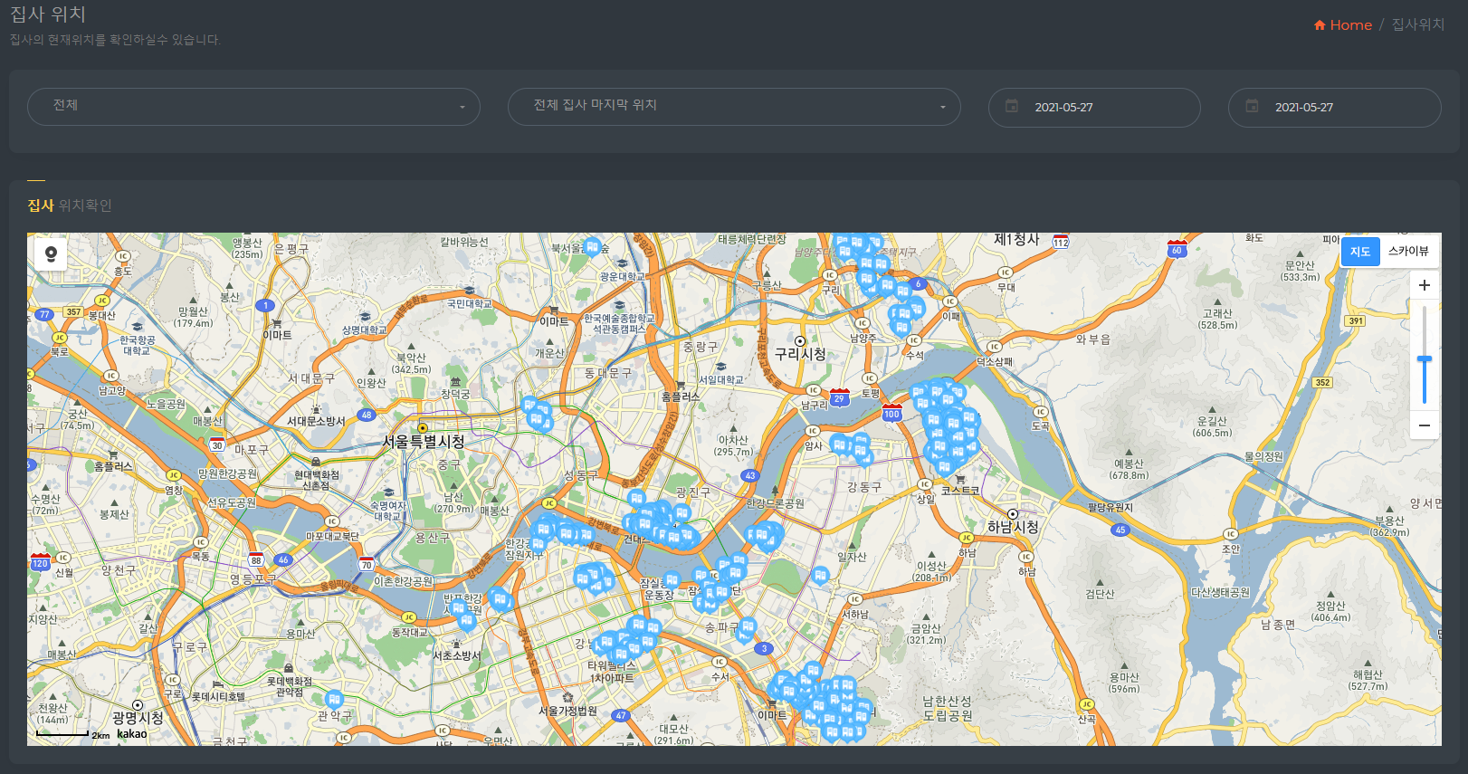이것 역시 카카오 Maps 레퍼런스를 활용한 기능으로 각 클라이언트에서 정해진 시간마다 위도와 경도를 받아 DB에 적재하고 이를 화면 상에 그려주었다.